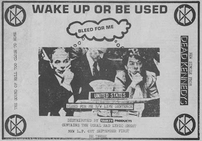 thought id write a wee bit more about this as im now hame from work. although 'life sentence', itself, is a great wee tune. its a big shame though that the b-side of this is not 'riot', the song that almost joins onto this on their lp 'plastic surgery disasters'. those two songs together are, what i think, almost the best the dead kennedys ever did. it would have just topped of this single and maybe made it their greatest release. still 'bleed for me' is a classic in all proportions and cant be over looked no matter what song is on the b-side. as i said 'life sentence is a great song too. of all the songs the dead kennedys had. they could have released about a hundred singles (i know im exaggerating and cant spell) but putting this on a 7 inch was truely genius and slightly risk taking. not politically, but musically. they had many other more sing-a-long type stuff that the public would have devoured. they did this one instead and my hat goes off to them. ''smile at the mirror as the cameras click, and make big business happy.'' genius.